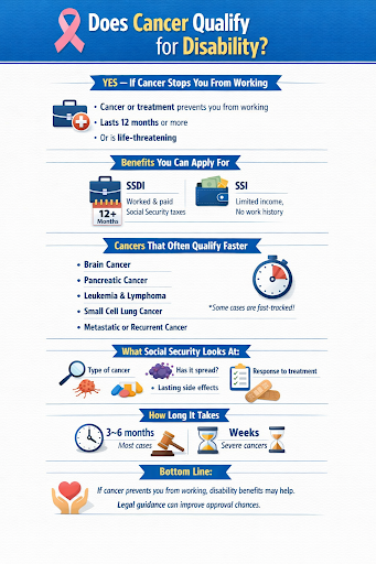 Cancer may qualify for disability benefits if it significantly limits your ability to work. The SSA reviews cancer claims based on the type, severity, response to treatment, and lasting side effects. Applicants should submit detailed medical records, treatment history, and evidence of long-term limitations. If a claim is denied, filing an appeal with proper documentation and legal support can improve app
